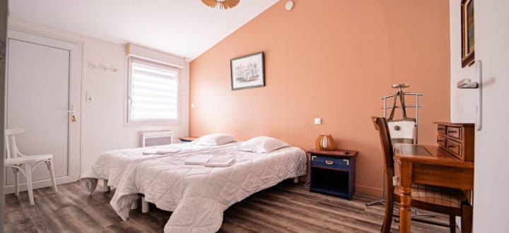 Cette chambre dispose d’un grand lit 2 personnes de 140, une télévision, des placards de rangements et d’un wc avec lave-main.