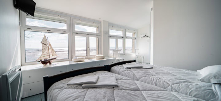 Une chambre vue sur mer avec 2 lits de 90 et un chevet, une salle d’eau avec douche, vasque, wc et sèche-serviettes.