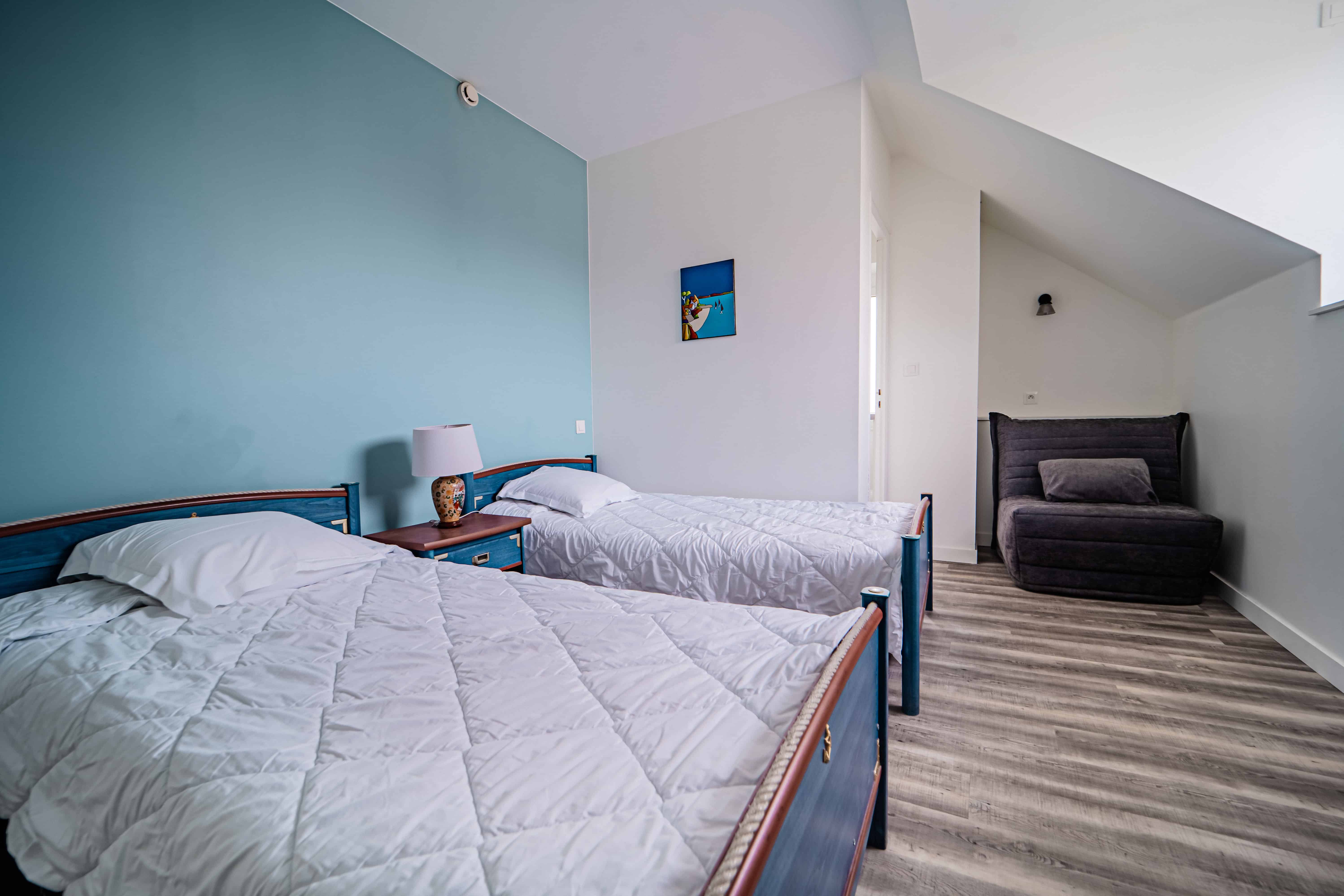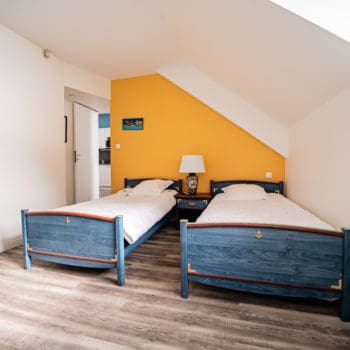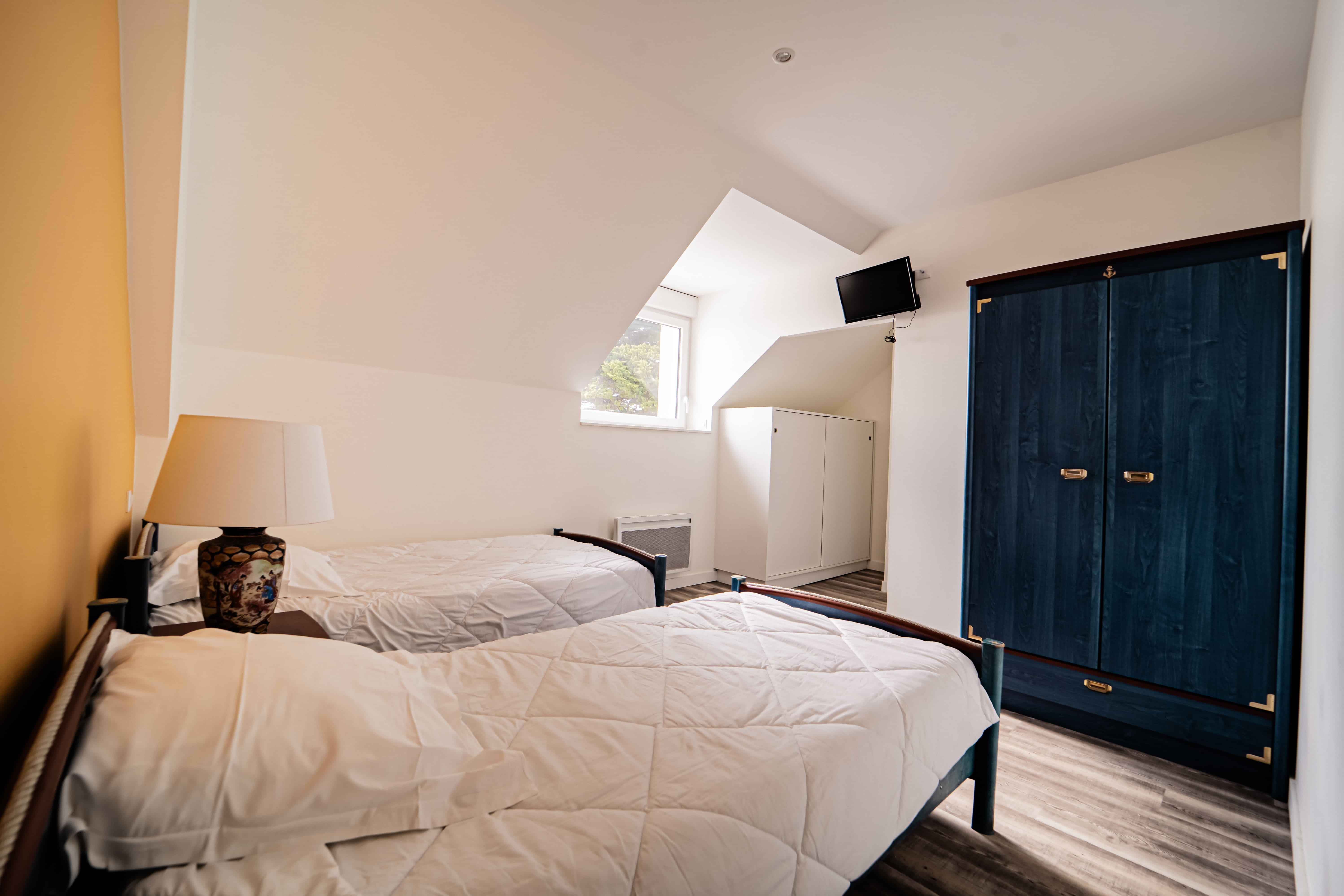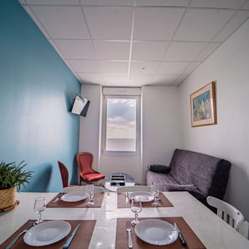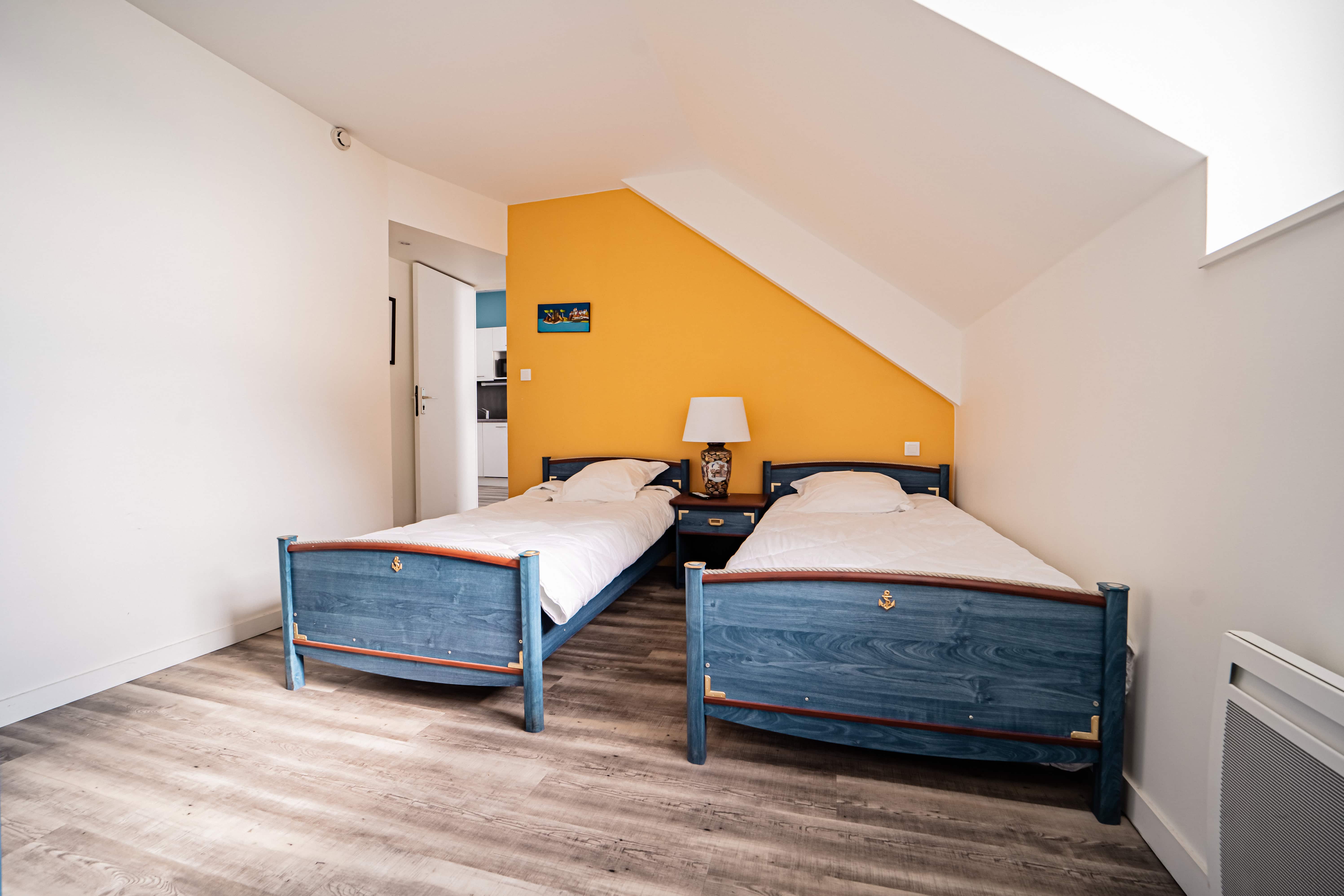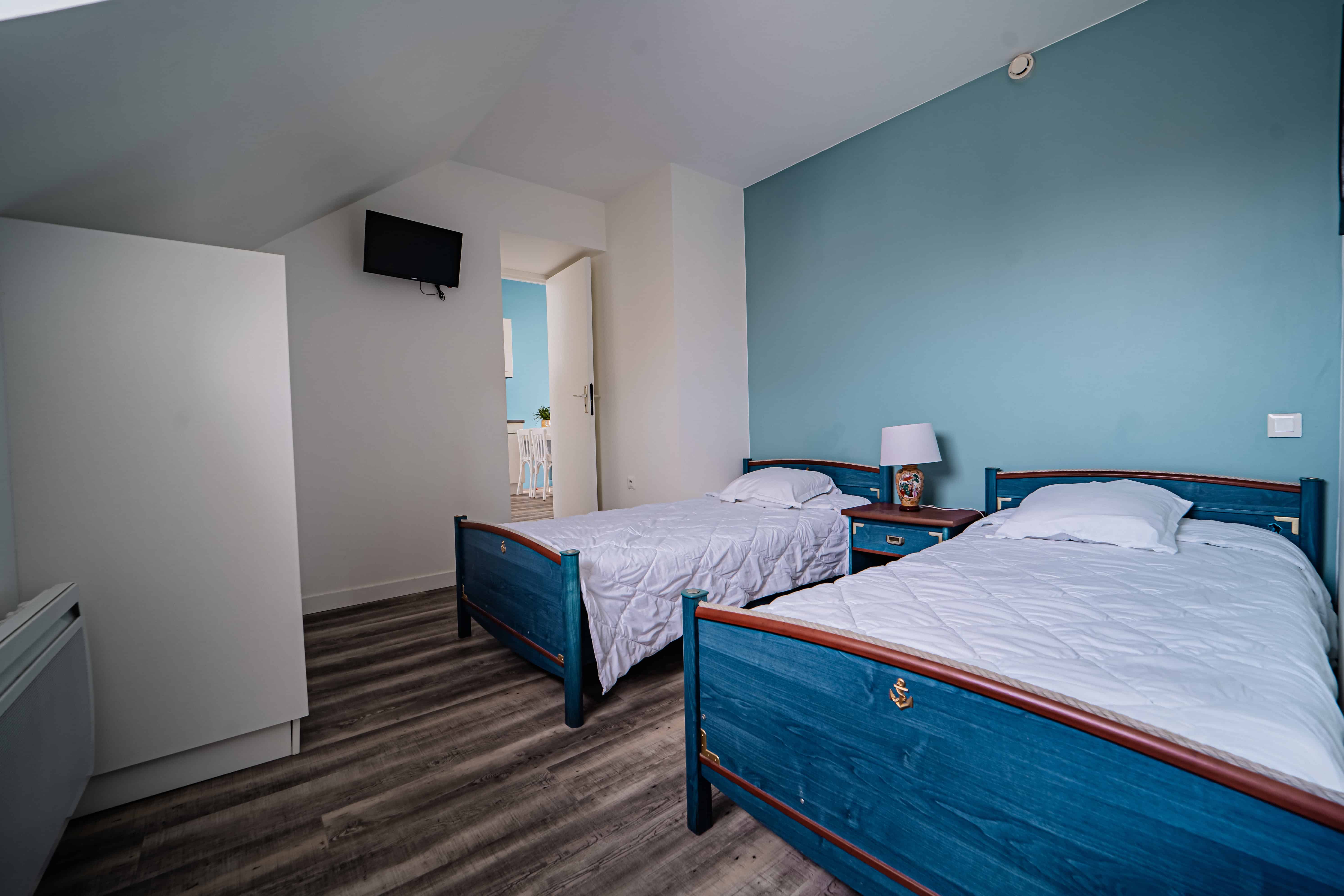 Il est constitué d’une belle pièce de vie avec cuisine aménagée (four traditionnel, four micro-ondes, plaque de cuisson, réfrigérateur-congélateur, une hotte), une table, des chaises, un canapé, télévision. 2 chambres : la 1 ère chambre vue sur mer avec 2 lits de 90 et un chevet une armoire, un dressing, une télévision et salle d’eau privative (douche, wc, vasque avec meuble), 2ème chambre vue sur cour 3 couchages (2 lits de 90 et un canapé convertible 1 place, un placard, une télévision et salle d’eau privative (douche wc et vasque).