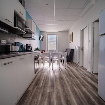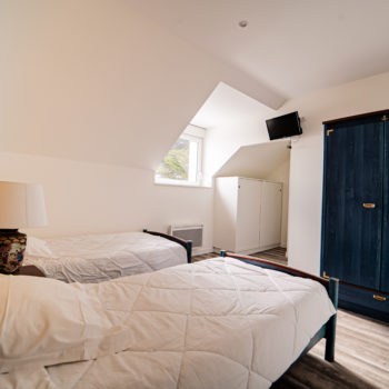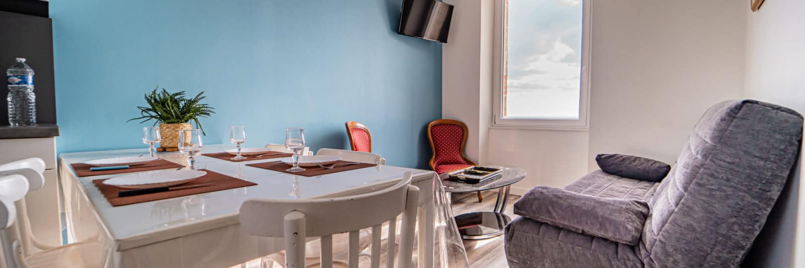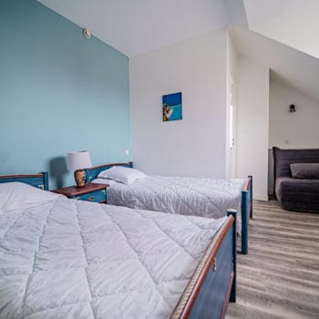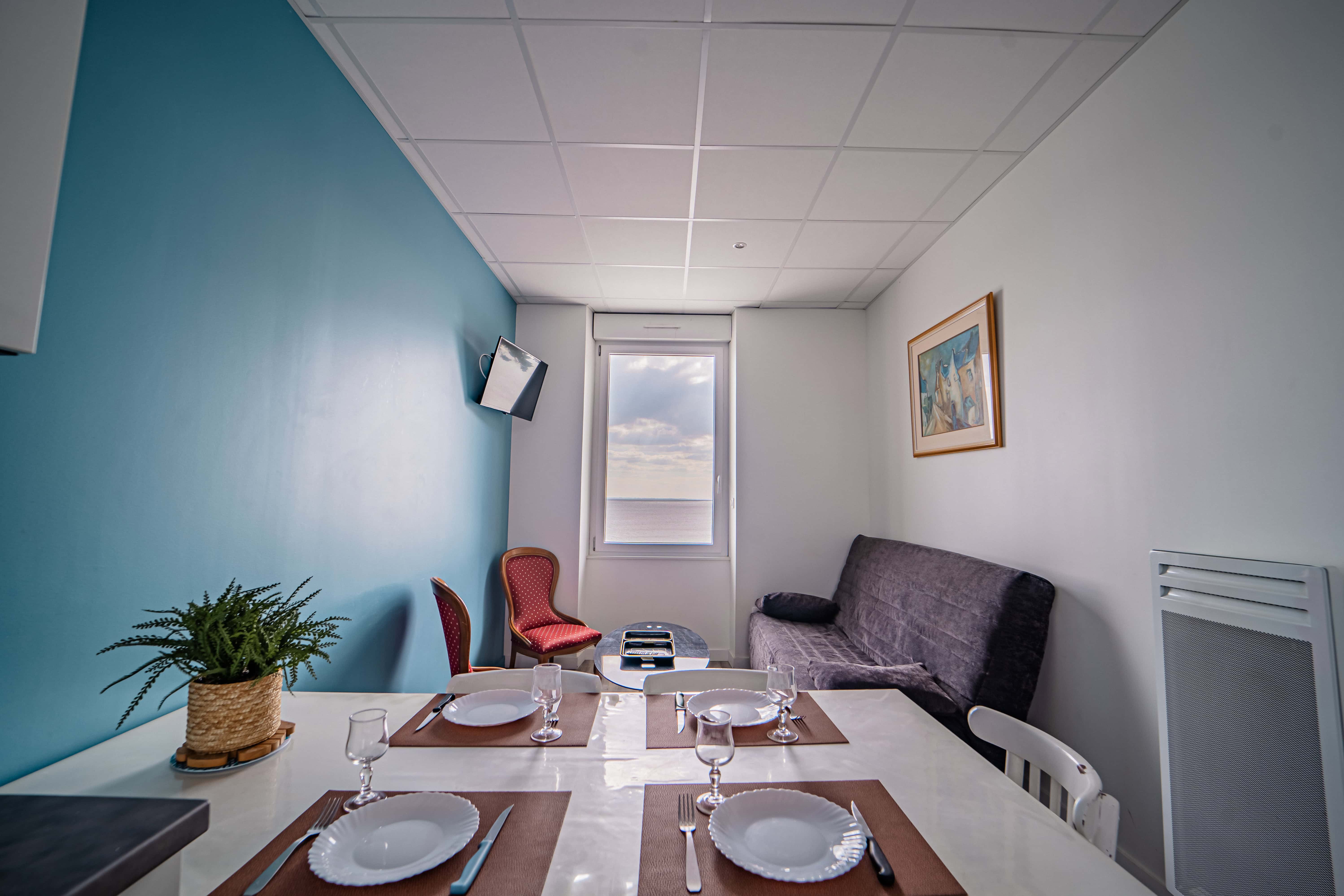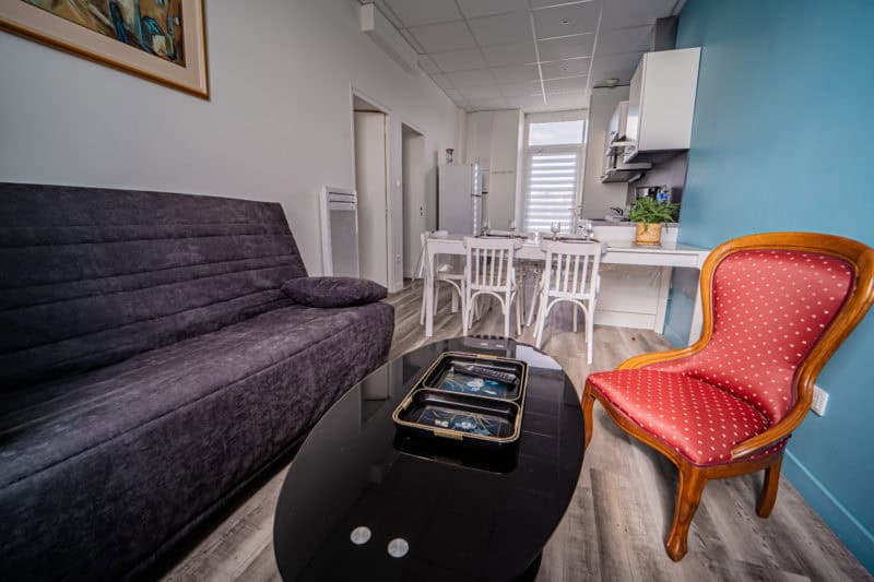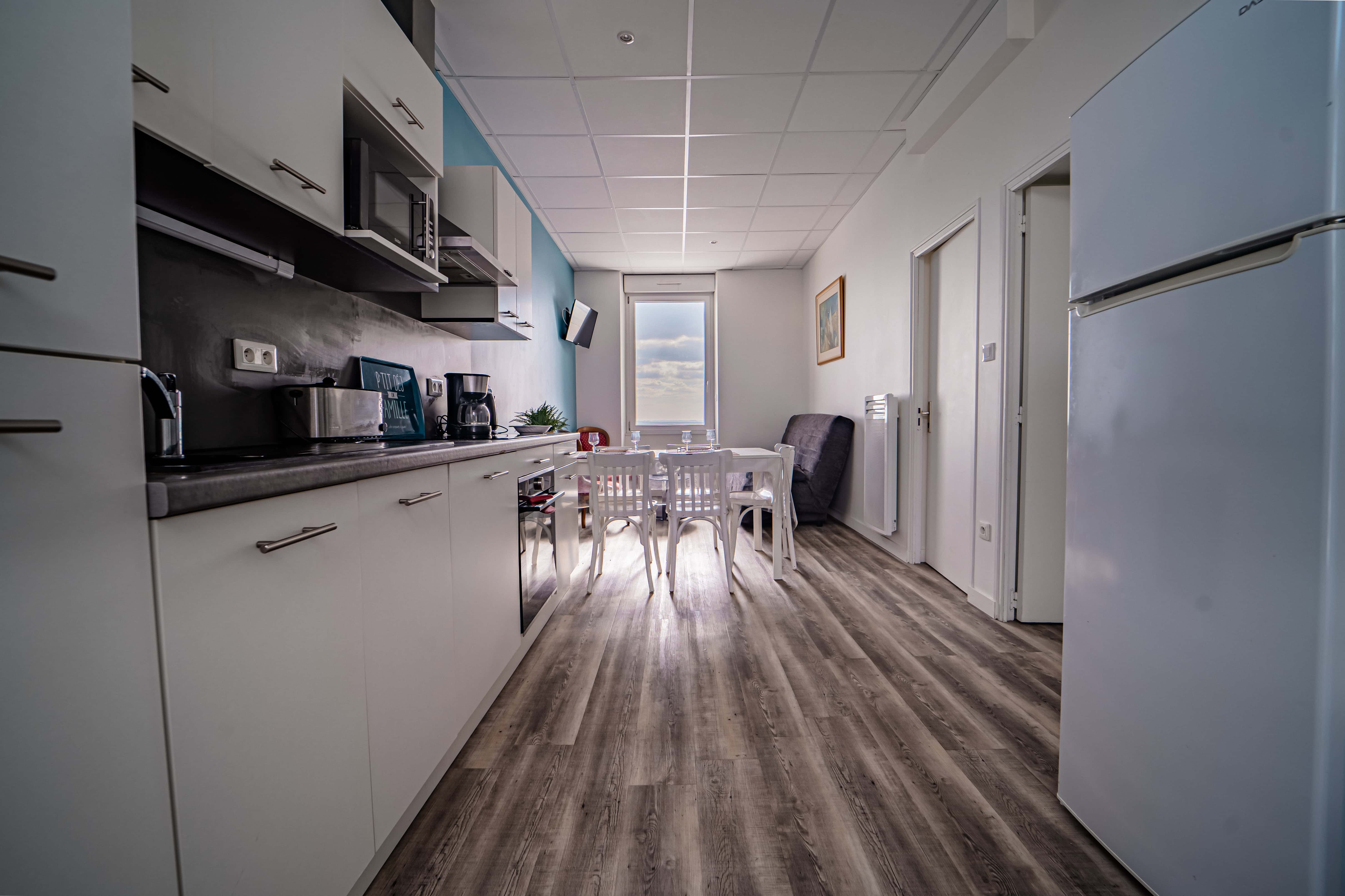 Il est constitué d’une belle pièce de vie avec cuisine aménagée (four traditionnel, four micro-ondes, plaque de cuisson, réfrigérateur-congélateur, une hotte), une table, des chaises, un canapé, télévision. 2 chambres : la 1 ère chambre vue sur mer avec 2 lits de 90 et un chevet une armoire, un dressing, une télévision et salle d’eau privative (douche, wc, vasque avec meuble), 2ème chambre vue sur cour 3 couchages (2 lits de 90 et un canapé convertible 1 place, un placard, une télévision et salle d’eau privative (douche wc et vasque).