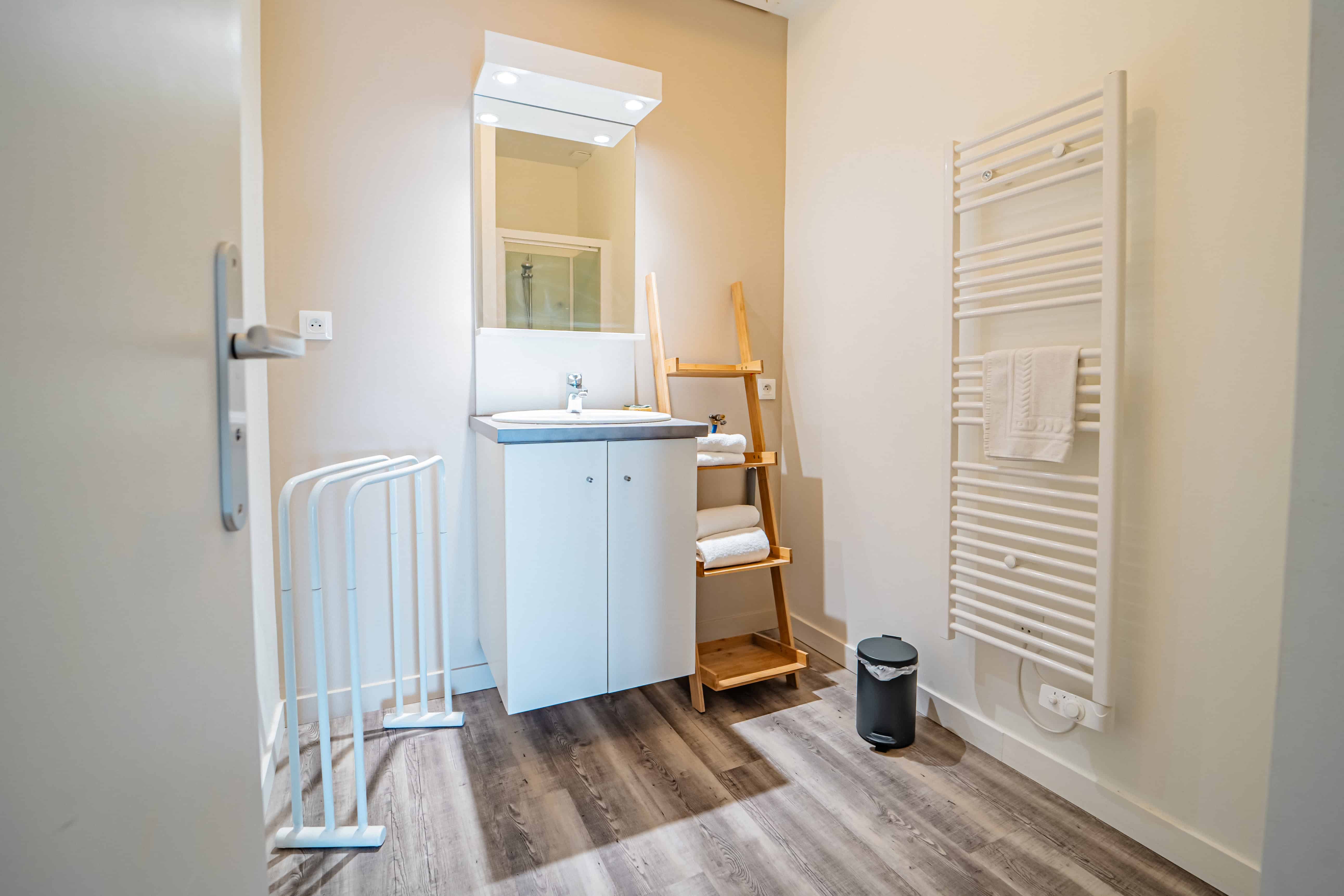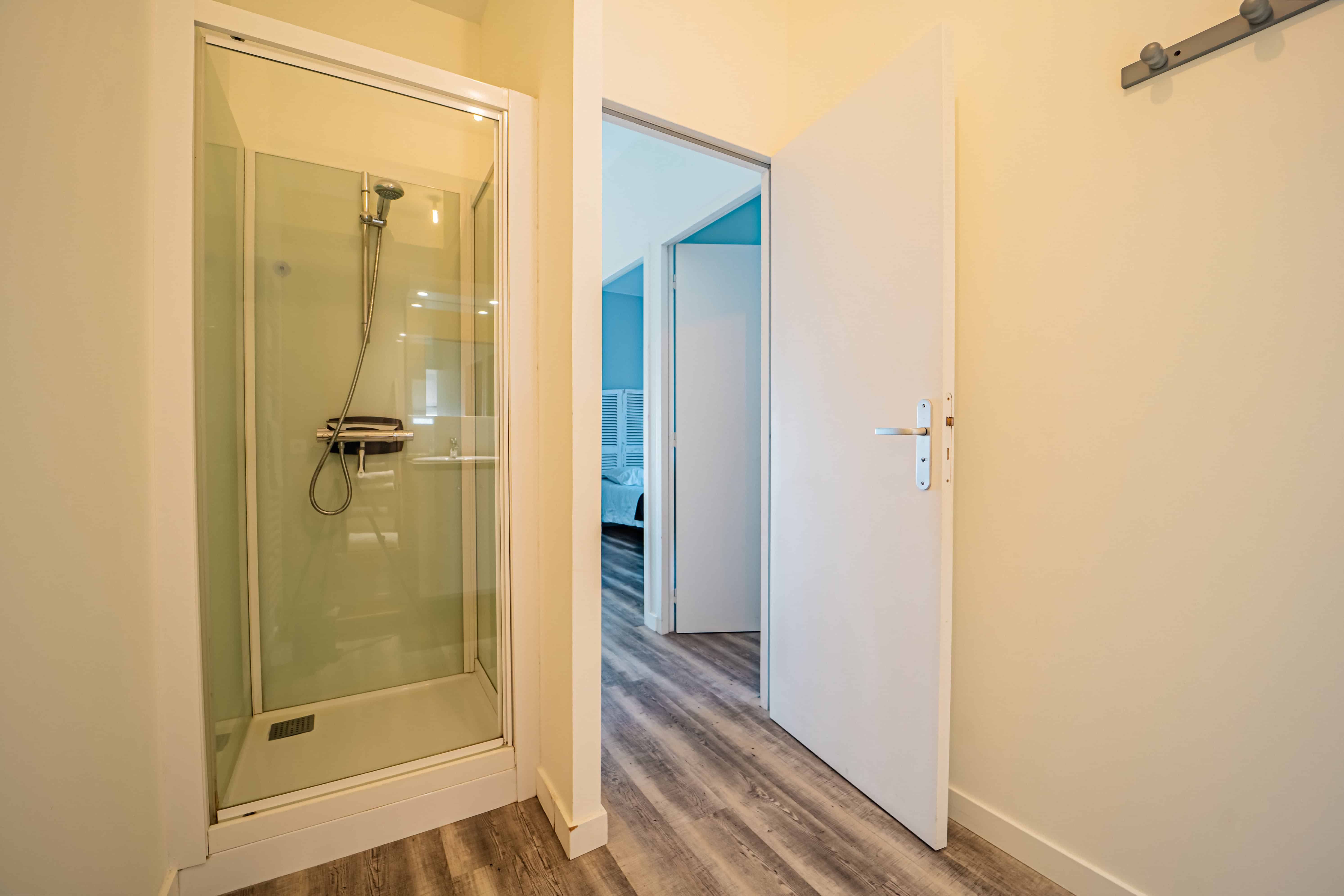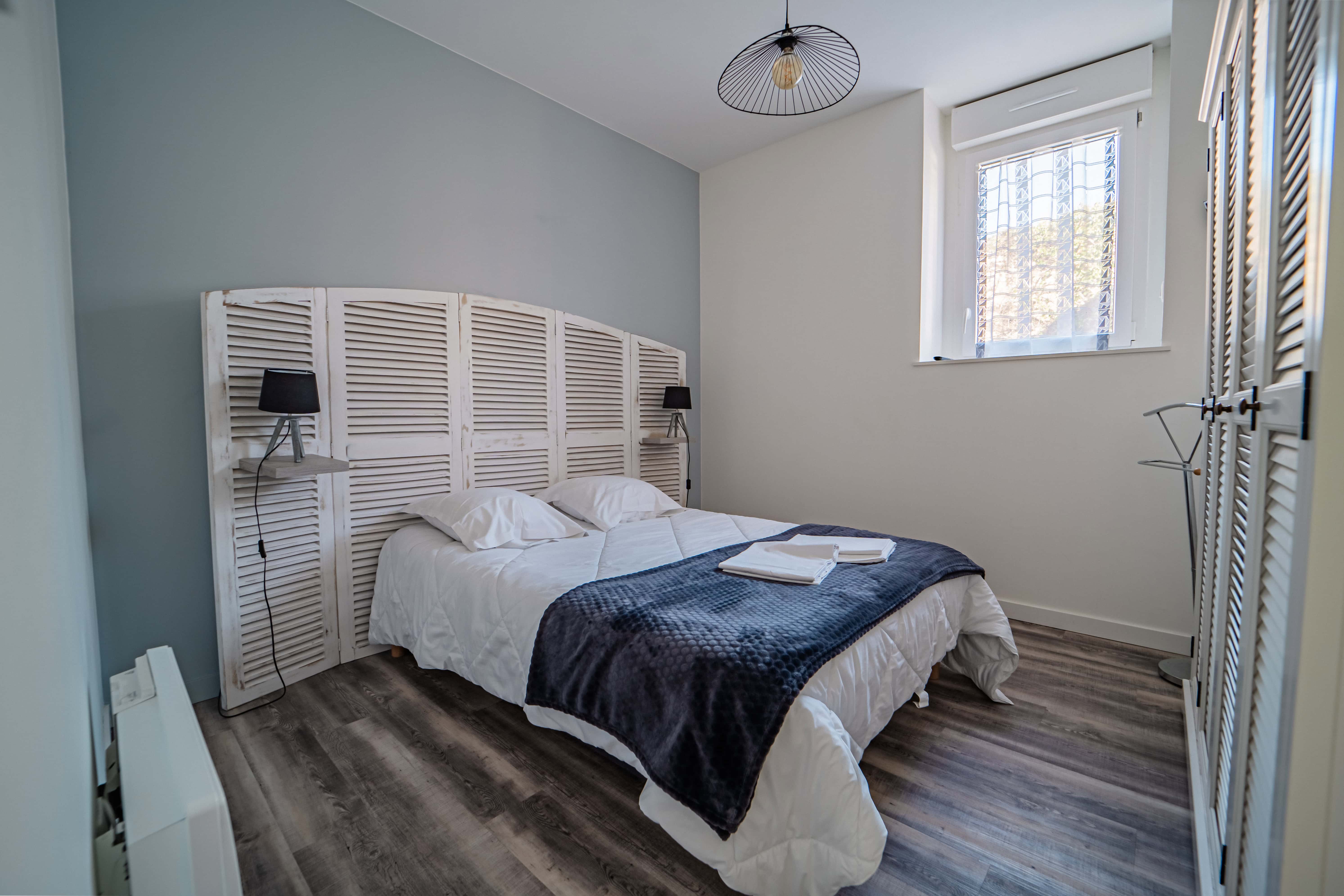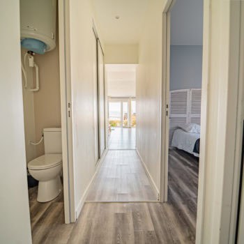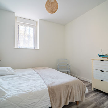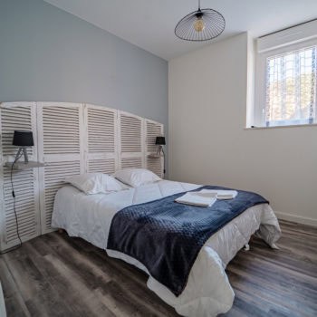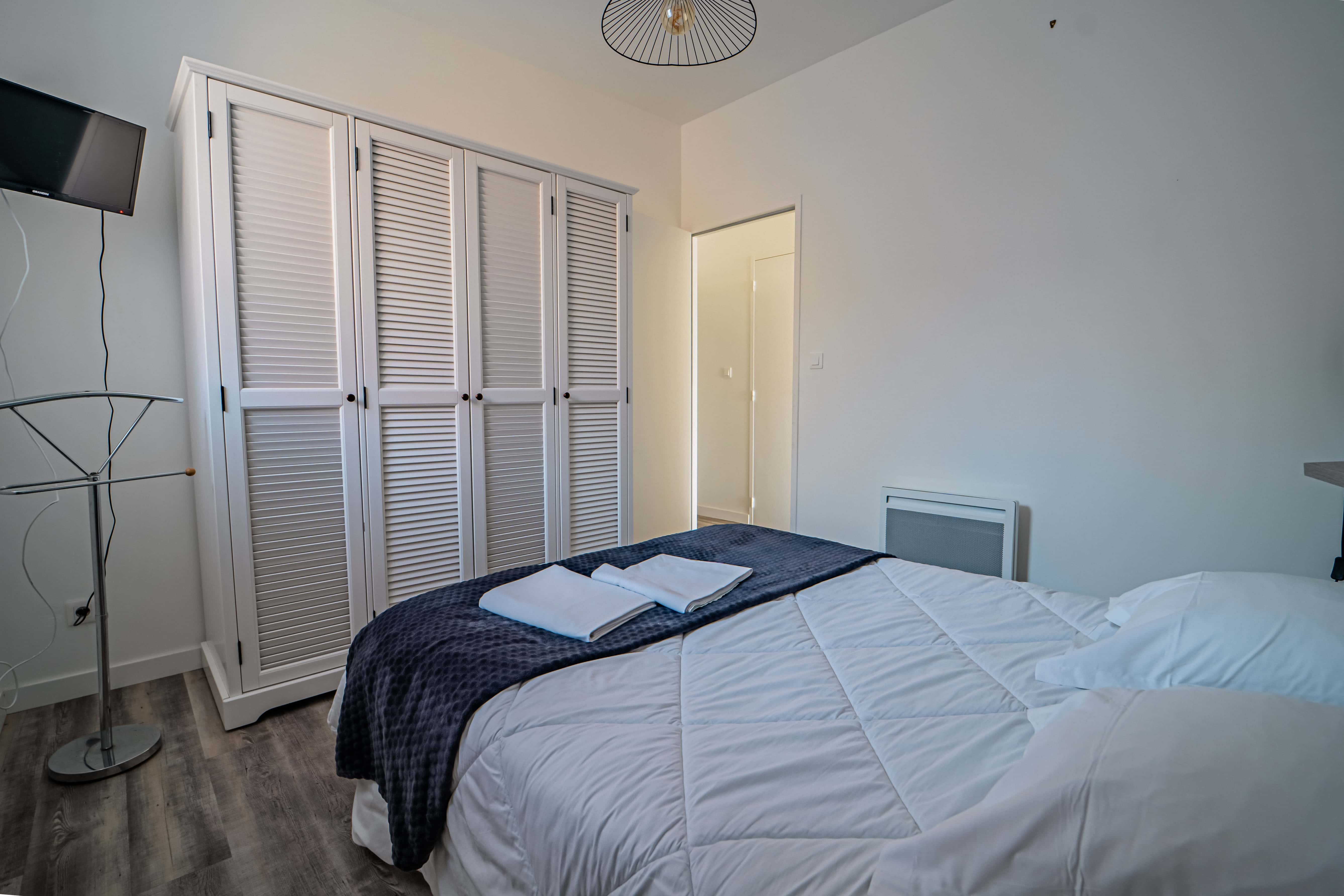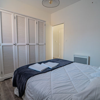 Intérieur : 1 chambre avec 1 lit double + placard + télévision, 1 chambre avec 2 lits doubles + commode + télévision, 1 salle de bain avec douche et vasque, 1 WC séparé, 1 dressing, 1 pièce de vie avec cuisine aménagée (four, micro-onde, frigidaire...), table et chaises, 1 coin salon avec canapé lit et 2 fauteuils.